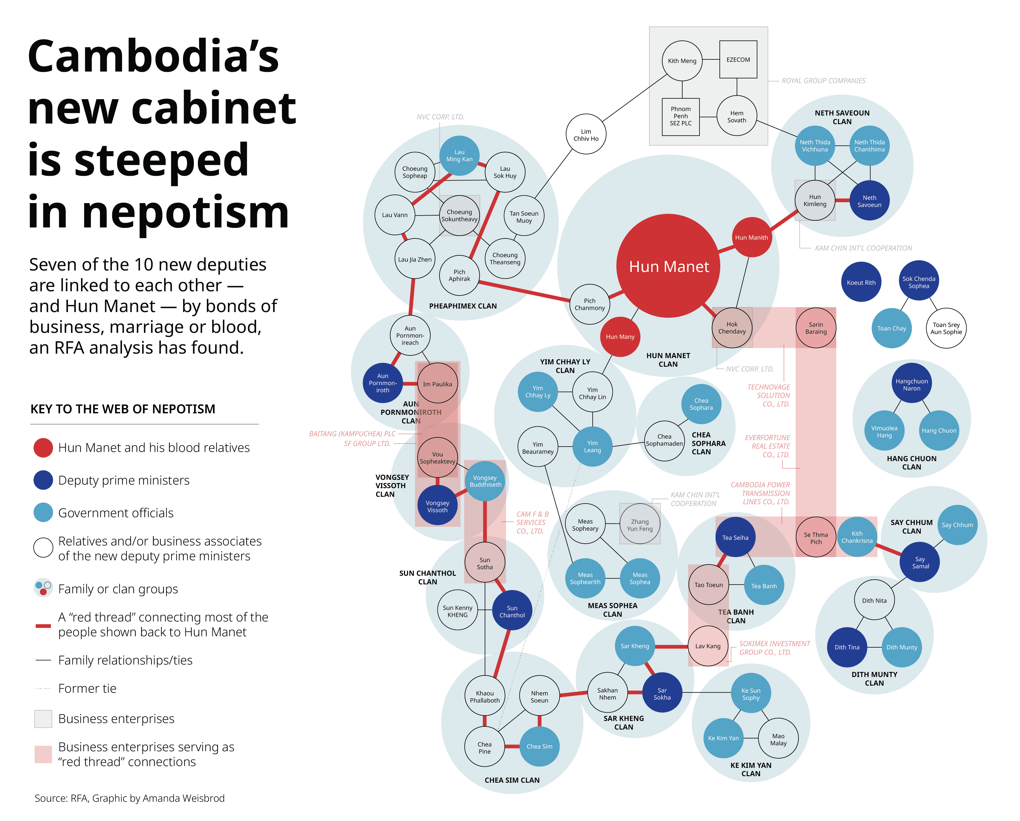 Seven of the 10 new deputies are linked to each other – and Hun Manet – by bonds of business, marriage or blood, an RFA analysis has found.