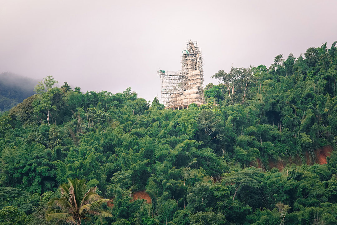 Nearby, an unmarked large white compound commands the wide floodplain, where the signs of wealth include a host of golden spires and immense Buddha statues. It is the only significant settlement since leaving China and seems mysterious, bristling with satellite dishes and radar antennas, but no flags or military or government markings. On the opposite bank is a large Laotian patrol boat. Around the corner in the distance is Chiang Saen, Thailand. This is the Golden Triangle today, a triumvirate of the military, narcotics smugglers, and casinos.