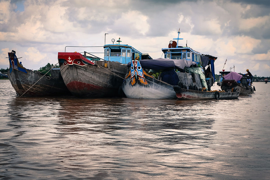 The farm owner explains that the fish grow for 10 months. He sells one batch of fish every year to a Vietnamese fish-processing company for export to Japan, the U.S., and China. The stock of fish farmed in Vietnam’s delta is now greater than that from its other freshwater and seawater fisheries combined. The farmer says that they don’t eat their own stock. It’s taboo, bad luck. He tells me that when he was a child, they could catch fish off the side of their boat. Nowadays they buy fish from the market. This year when the water was very low, the oxygen levels fell dramatically and the fish suffocated in the intensively packed cages. They improvised by putting a boat in front of the farm and ran the propeller to force aerated water through the cages.