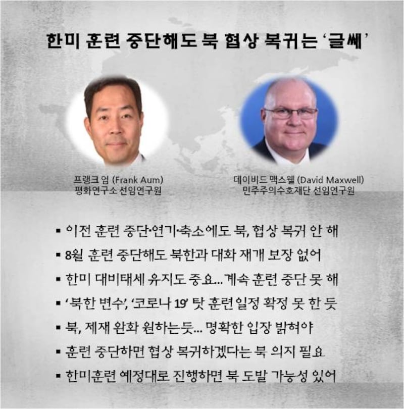 미 국방장관실 선임보좌관을 지낸 프랭크 엄 평화연구소 선임보좌관과 한미연합사령부 작전 참모 출신의 데이비드 맥스웰 민주주의 수호재단 선임연구원은 최근 RFA 자유아시아방송에 북한의 입장에서 한미연합 군사훈련의 중단만으로는 대화 재개와 협상 복귀의 전제 조건으로 충분치 않다고 강조했습니다.