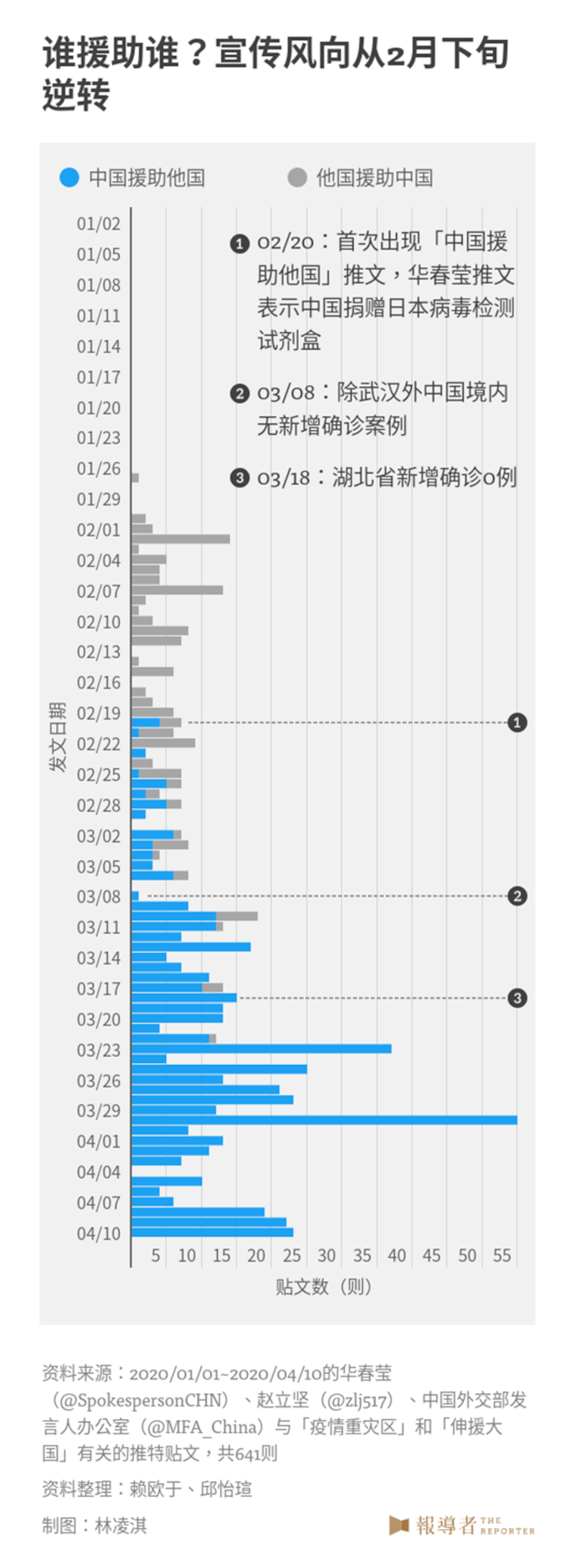 华春莹在2月20日用日语发布第一则有关中国援助他国的推文,提到中国捐赠一批病毒检测试剂盒给日本。在此之前,中国仍处于被援助的状态,例如在2月2日共有14条相关推文,感谢德国、俄罗斯等对中国的援助。因此2月20日成为中国扭转国际形象的起始点,在之后的几天里,中国开始向伊朗、巴基斯坦等国输送抗疫物资。
