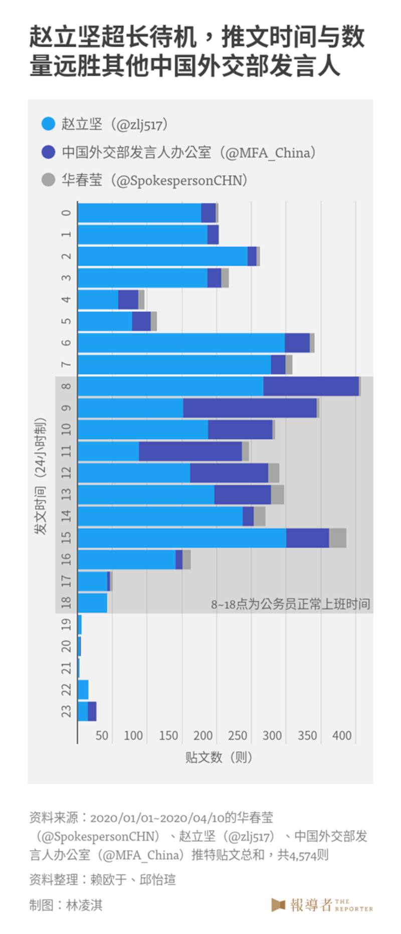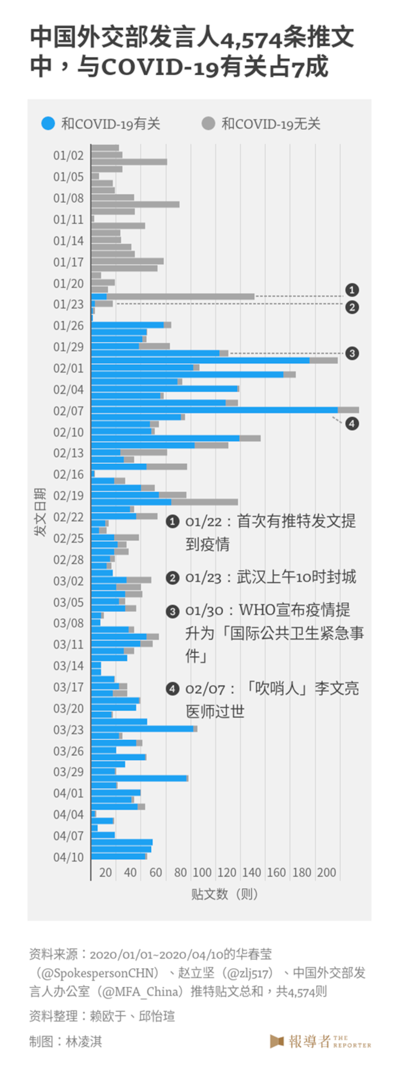 我们搜集中国外交部发言人华春莹(@SpokespersonCHN)、中国外交部发言人赵立坚(@zlj517)、中国外交部发言人办公室(@MFA_China)3个账号于2020年1月1日至4月10日在推特的发文数据,共计4,574笔,试图从中解析中国政府如何在社群媒体上谈论COVID-19疫情,透过中国的外交发言系统与发言人的发言频率、论述内容,来了解中国对外舆论塑造出的形象。