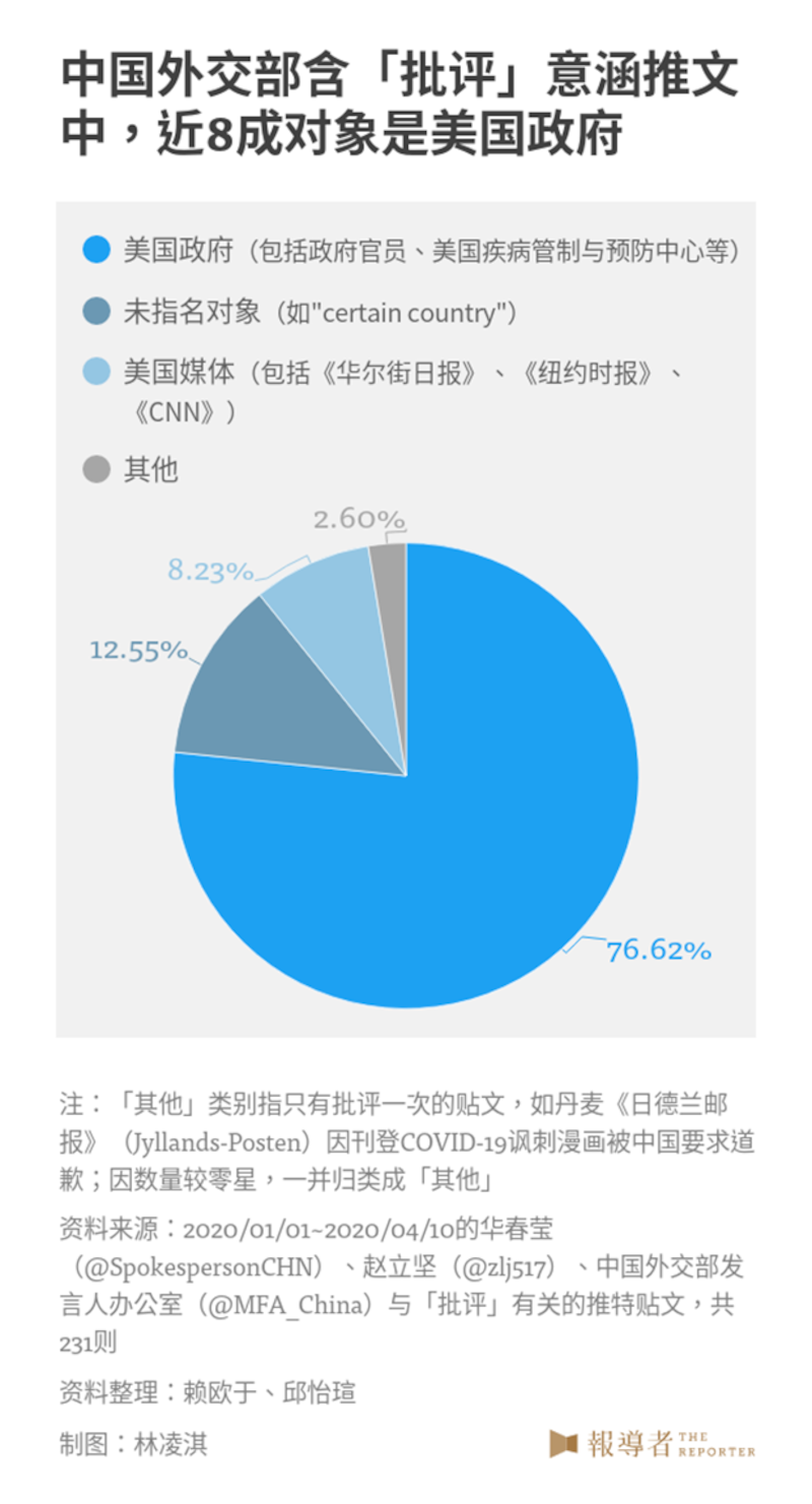 除了直接论述自己为全球抗疫的付出,中国官方推特也透过与他国比较来“凸显”自己。从本篇报导搜集的数据可以发现,美国是中国对外批评的最大箭靶,在带有批评对象的231篇推文中,近8成是批评美国政府。